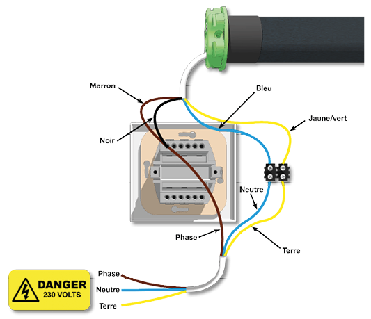 Brancher les fils « Noir et Marron » sur la borne de la « phase ».